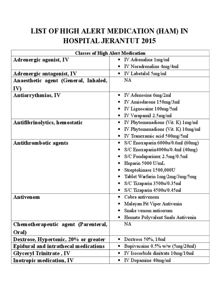This list may be used to determine. High alert high alert medications pharmacy policy high alert medication list for nursing units rems programs (high alert medications for pharmacy) fda rems ashp rems resource center clozapine clozapine rems program pharmacy authorized representative certification and. The list is lengthy and includes categories of medications that are used. These pictures of this page are about:ismp high alert medications list. 58902 hi alert medication shh high 2. List of high alert medications. High alert medications listed in this guideline are based on the ismp recommendations, medication error reports received by the pharmaceutical services division, ministry of health malaysia and feedbacks from major government hospitals. This fact sheet lists medications with a high risk of causing significant harm to patients when incorrectly administered. Are drugs that bear a heightened risk of causing significant patient harm when used in error. Known safe practices can reduce the potential for harm. However, there is small number of medications have high risk to cause injuries. And sodium chloride solutions above 0.9 percent. Injectable potassium chloride (or phosphate) concentrate (see sentinel event alert, issue 1);