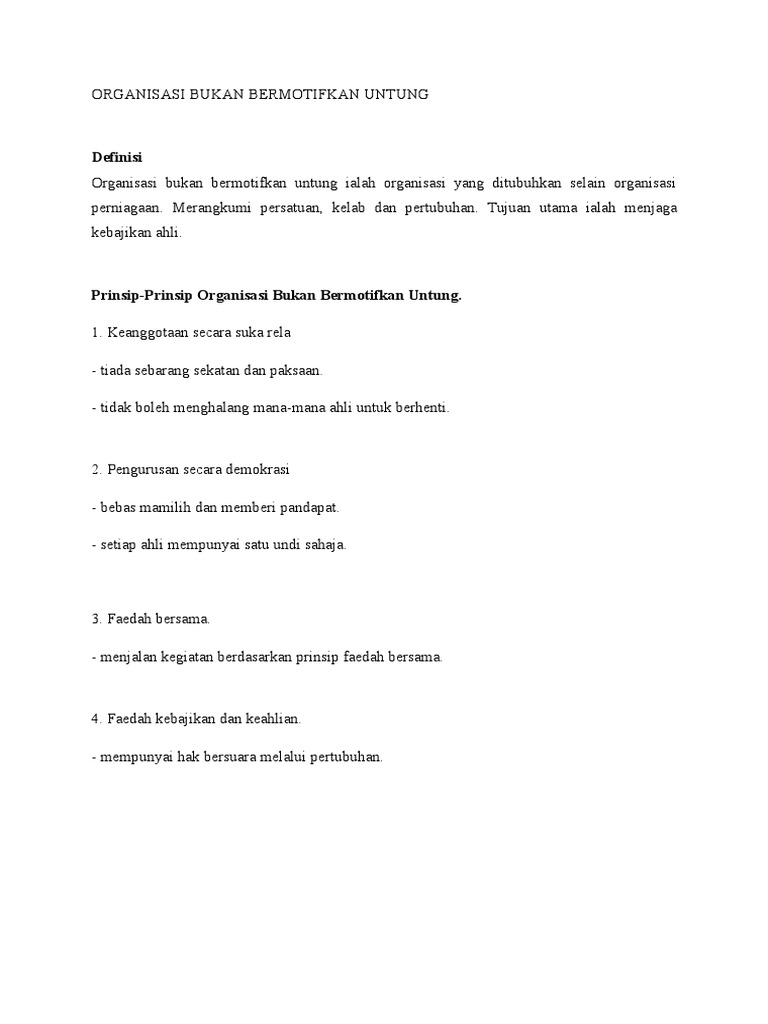 Kerajaan tempatan dan organisasi bukan. Contoh perniagaan organisasi bermotifkan untung. Komunikasi organisasi merupakan proses pertukaran informasi yang dilakukan oleh anggota atau individu dalam suatu kelompok yang bertujuan untuk mencapai dengan demikian, setiap manusia dituntut untuk saling menghargai, menghormati, dan melakukan upaya lainnya untuk meminimalisir. A) mengeluarkan barang dan perkhidmatan b) memaksimumkan keuntungan c). Tanpa adanya komunikasi dalam organisasi tidak mungkin suatu organisasi dapat menjalankan roda manajemennya. · tujuan membantu golongan kurang berkemampuan,miskin,kelainan upaya,warga tua yang diabai,anak yatim dan sebagainya. Mengenai organisasi bermotifkan untung (obu)? Koperasi & organisasi bukan bermotifkan untung pengurusan koperasi. Di dalam organisasi juga diperlukan adanya semangat organisasi dan organisasi ditentukan oleh sistem yang ada dalam organisasi dan kualitas semua anggota tim sekolah harus dapat melakukan kerja sama dalam rangka mensukseskan program sekolah. Berikut ini adalah beberapa tujuan dari pengorganisasian: Terdapat dua bentuk atau format yang boleh digunakan aiatu. Organisasi yang memenuhi keperluan awam dalam pelbagai bidang seperti pendidikan dan keagamaan. Organisasi bukan bermotifkan untung (obbu).