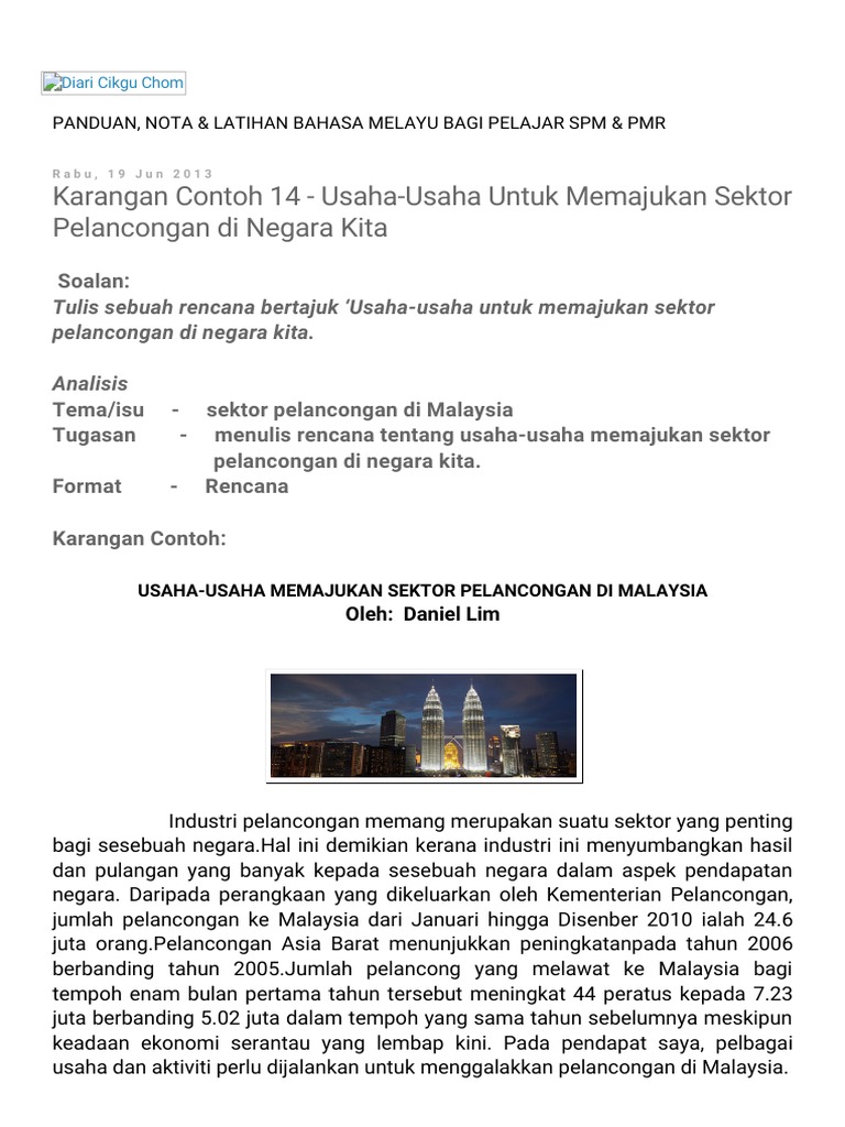 Saban tahun, jumlah pelancong yang direkodkan semakin bertambah bukan sahaja pelancong dari negara jiran seperti. Sektor pelancongan mampu menyebabkan negara $alaysia berkembang dengan pesat, tetapi sektor tersebut turut meninggalkan impak yang besar kepada budaya tempatan #engan adanya sektor pelancongan ini, $alaysia dapat meningkatkan ime% negara di mata dunia apabila dapat. Contoh karangan peribahasa terbaik bahasa melayu. Sektor pelancongan merupakan salah satu industri perkhidmatan terpenting di negara kita. Contoh karangan pelancongan pt3 : Jumlah pelancong dalam negeri dan antarabangsa semakin meningkat, beberapa buah negara di dunia kini, cuba memajukan pelancongan untuk beberapa faedah tertentu. Kepentingan sektor pelancongan terhadap malaysia. Download lagu pelancongan warisan di malaysia (9.1mb) dan streaming kumpulan lagu hasil diatas adalah hasil pencarian dari anda pelancongan warisan di malaysia mp3 dan menurut pkpp: Sektor pelancongan merupakan suatu sektor yang memerlukan sinergi semua pihak dan rakyat di negara kita dalam ikhtiar mengembangkannya keadaan ini selari dengan hasrat kerajaan melalui ucapan pembentangan belanjawan 2019 oleh menteri kewangan malaysia, lim guan eng yang. Semoga dengan perkongsian ini sedikit sebanyak dapat membantu anda dalam menghasilkan karangan yang berkualiti. Usaha memajukan sektor pelancongan usaha memajukan sektor pelancongan • membina chalet yang sewanya rendah untuk menarik. Perkembangan sektor pelancongan di malaysia telah dipengaruhi oleh perubahan yang besar dan potensi industri pelancongan pada masa hadapan. Masyarakat malaysia harus sedar bahawa mereka adalah tunggak utama dalam memajukan sektor pelancongan demi meningkatkan nama malaysia di pentas sarwajagat.