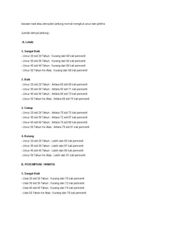 Masalah Sistem Elektrik Jantung from assets.hmetro.com.my Berikut penjelasan dan cara menghitungnya. Ia juga biasa disebut nadi. Sementara untuk detak jantung maksimal seseorang, tidak ada patokan bakunya. Ini menyebabkan pesakit mungkin tidak merasa sakit langsung ketika berlakunya serangan sakit jantung tersebut ataupun mempunyai simptom yang tidak tipikal sebagai contoh pedih ulu hati ataupun sesak nafas sahaja. Tidak ada penanggulangan yang lebih baik untuk mencegah penyakit dan serangan jantung, di samping gaya hidup sehat (seperti sering bangun lebih pagi, tidak sering tidur terlalu larut. Satu penyelidikan baru mendapati hanya dua tin minuman jenama monster atau 4 tin minuman red bull sudah cukup untuk menaikkan risiko degupan jantung yang tidak normal sehingga boleh mengancam nyawa. Namun, itu akan bervariasi tergantung pada kapan diukur dan apa yang anda lakukan segera sebelum membaca. Memiliki detak jantung yang normal memang sebuah anugerah yang sangat luar biasa, apa lagi jika memiliki pengetahuan tentang bagaimana cara mengukur detak jantung tersebut.